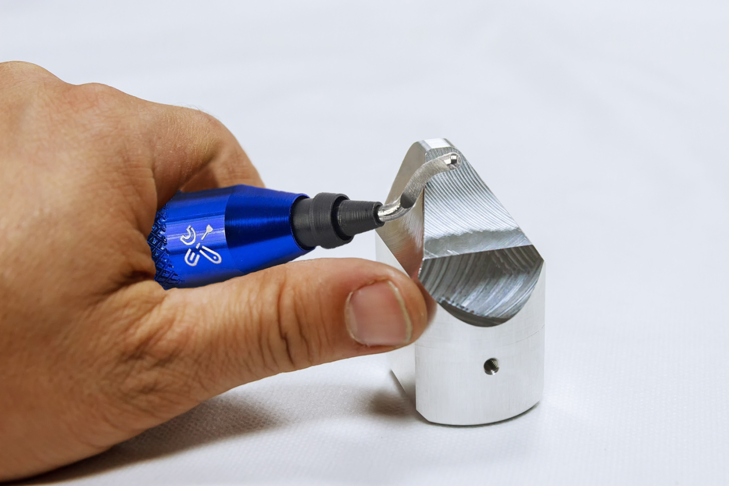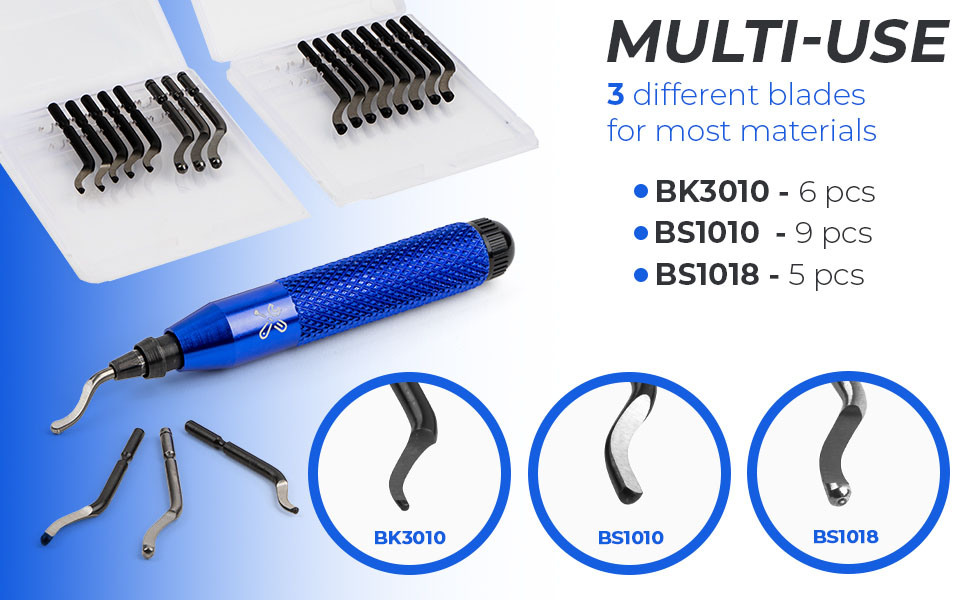 Our comprehensive blade package makes deburring all types of materials easy. On softer materials it can also be used to carve into the material, for example to create a bevel or chamfer, enlarge holes, etc.